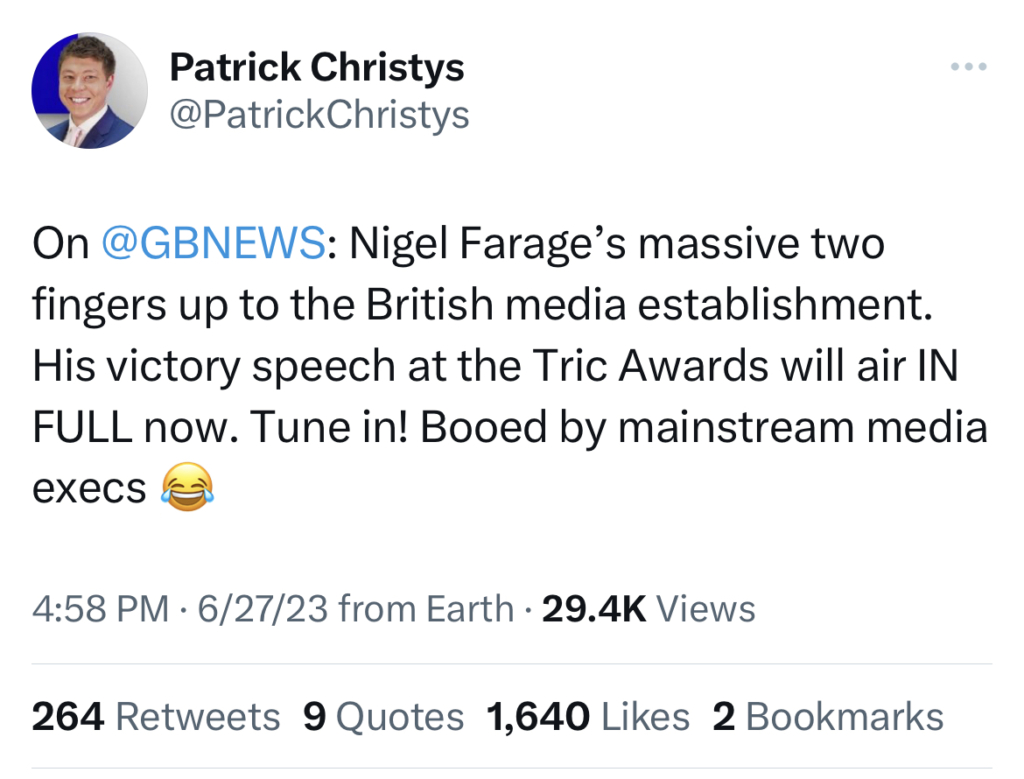 Patrick Christys - who hosts a GB News show daily at 3-6pm on GB News said: “Nigel Farage’s massive two fingers up to the British media establishment.”