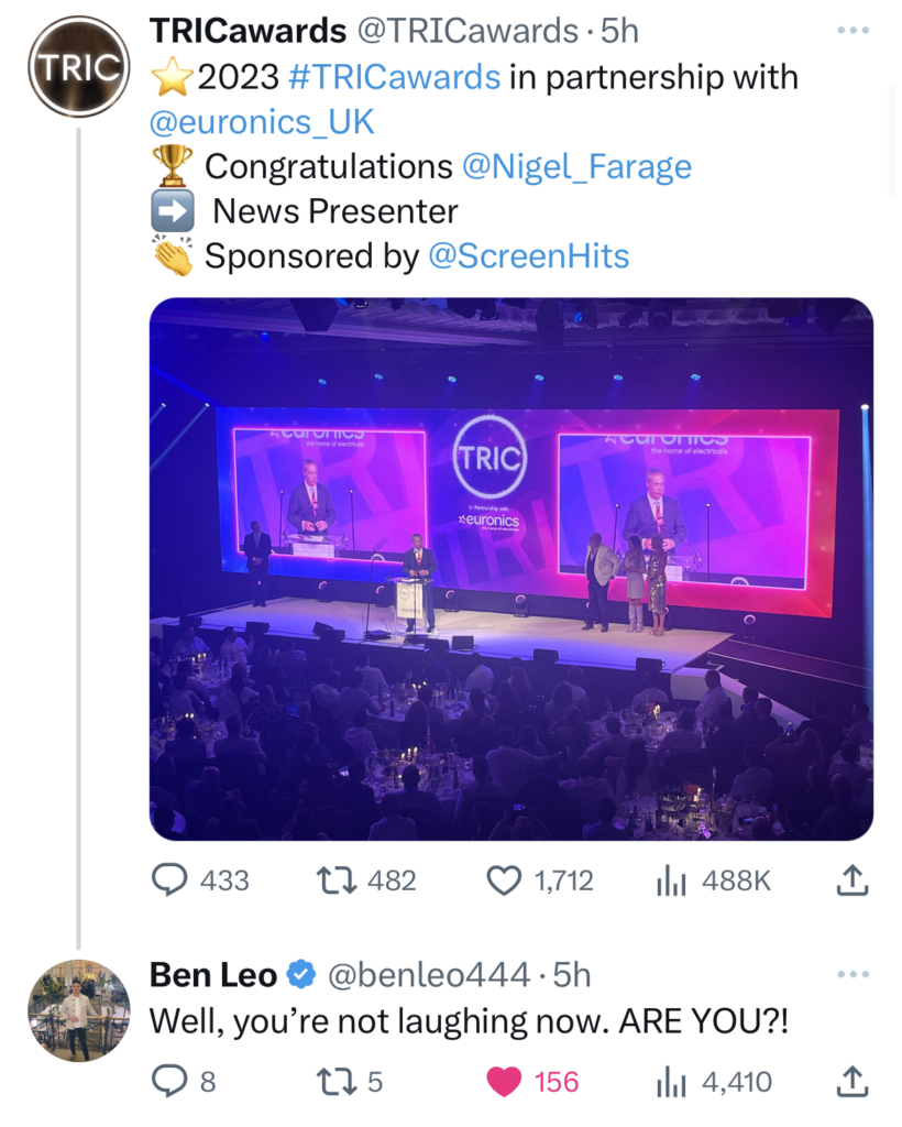 GB News producer Ben Leo used Nige’s famous Brexit Independence Day line on Twitter: “Well, you’re not laughing now. ARE YOU?!”